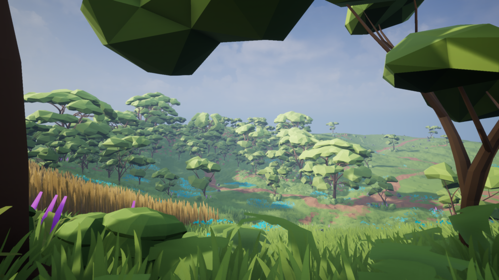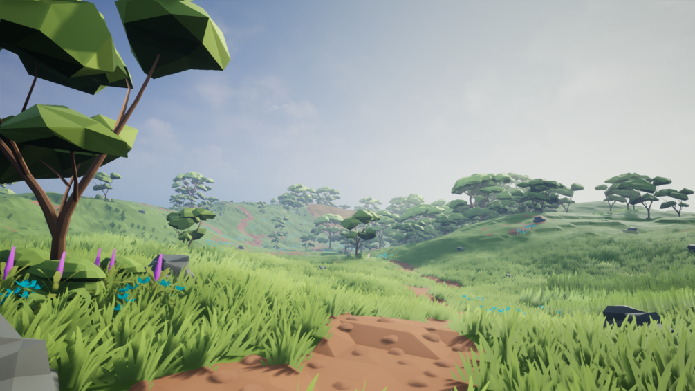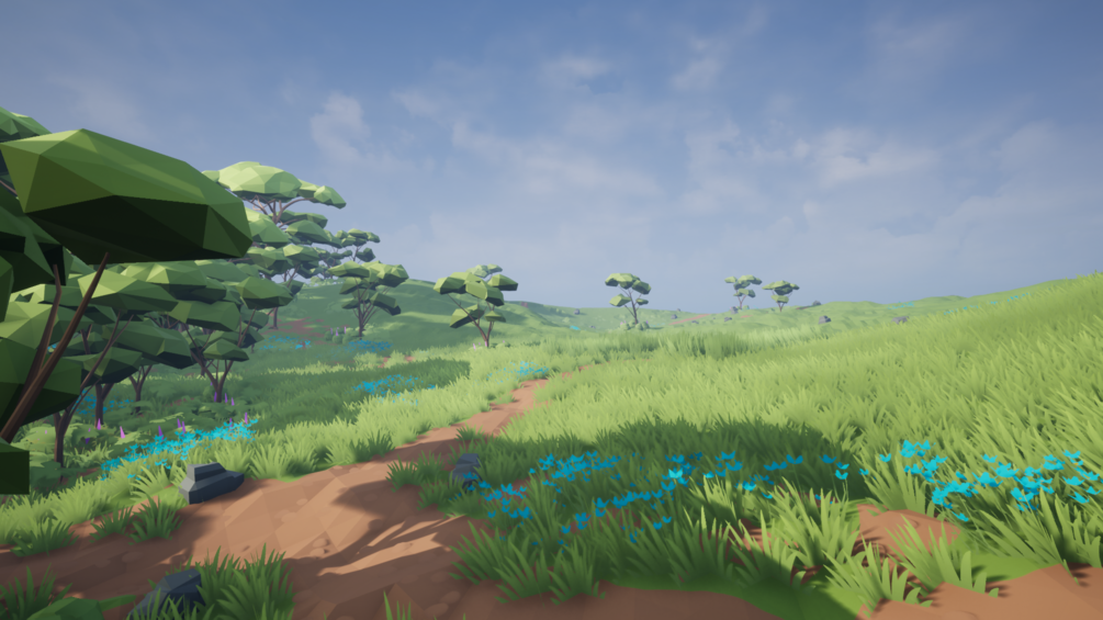 - A beautiful demo scene featuring assets by Quaternius, carefully crafted example materials and a stunning low-poly landscape-material with matching grass.